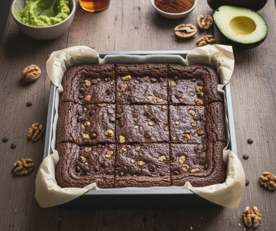 - U ovom receptu avokado zamjenjuje maslac i jaja, ali bez ikakvog kompromisa na teksturu. Daje browniju onu bogatu, “fudgy” sredinu koju svi traže, a okus avokada se uopće ne osjeti – kakao preuzima glavnu ulogu.