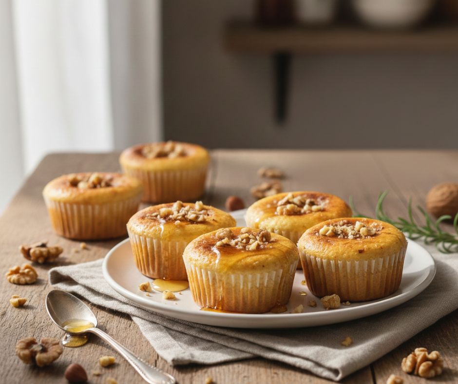 Ohladite mini cheesecake na sobnoj temperaturi, zatim stavite u hladnjak barem 2–3 sata. Prije posluživanja dekorirajte nasjeckanim orašastim plodovima i lagano prelijte medom. Po želji, dodajte prah cimeta ili kakaa.