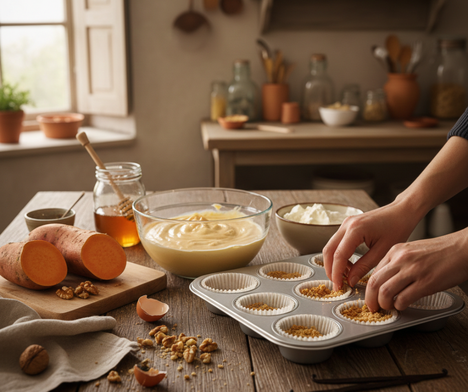Danas sam se igrala s mini cheesecakeovima od batata i meda i svaki pokret, svaki miris i svaka boja podsjetili su me zašto toliko volim peći. Dok sam miješala kremasti nadjev, osjećala sam toplinu sunčevih zraka kako ulaze kroz prozor, a misli su mi lutale između smijeha, mirisa pečenog batata i sitnih radosti koje nastaju samo dok stvaraš nešto svojim rukama.