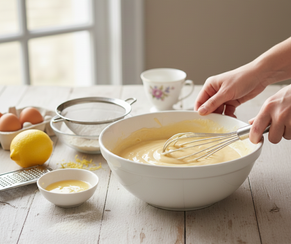 Dodaj naribanu limunovu koricu i limunov sok te kratko promiješaj da se aroma ravnomjerno rasporedi. U posebnoj posudi pomiješaj brašno, prašak za pecivo i sol. Suhe sastojke postupno umiješaj u smjesu jaja, miješajući nježno pjenjačom ili lopaticom. Smjesa treba ostati glatka, bez grudica.