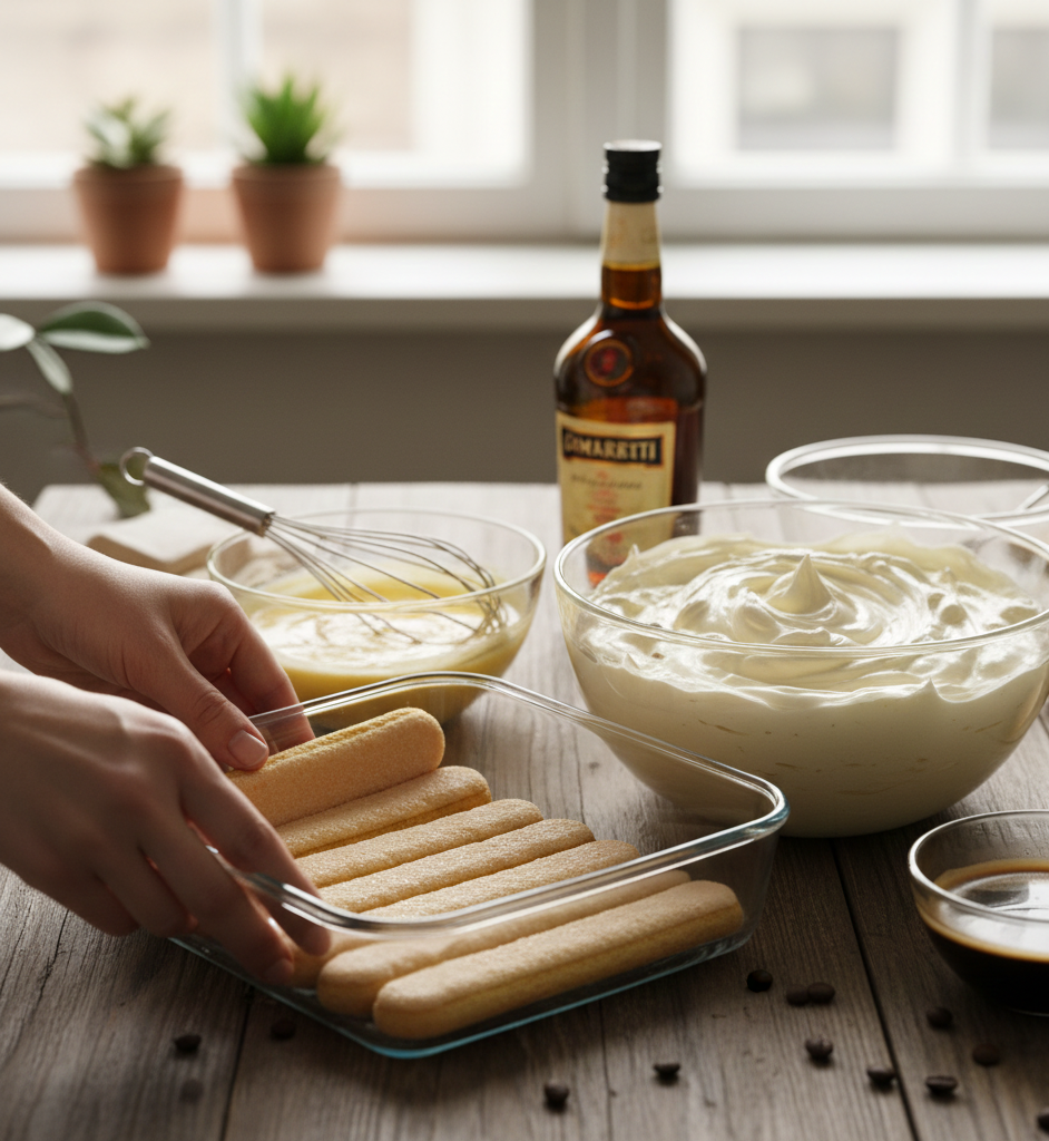 U prikladnu posudu (20×20 cm ili individualne čaše) stavite prvi sloj piškota umočenih u kavu. Preko piškota rasporedite sloj kreme od mascarponea. Ponovite postupak: sloj piškota pa sloj kreme, završite slojem kreme. Pokrijte i stavite u hladnjak na najmanje 4 sata, idealno preko noći.
