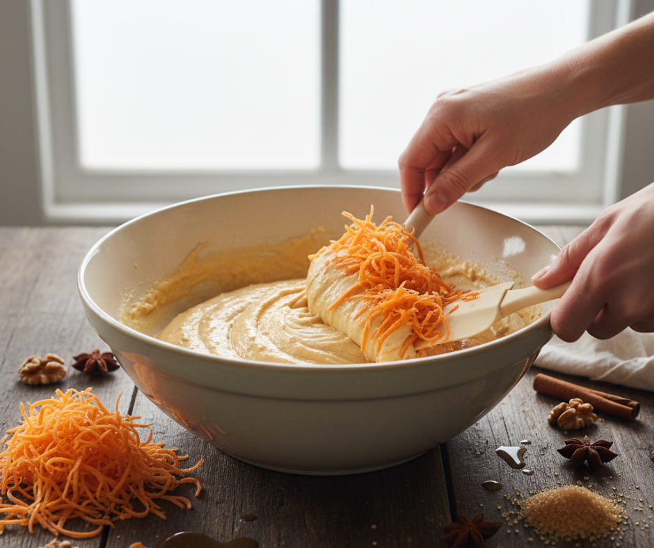 U drugoj zdjeli pomiješaj brašno, prašak za pecivo, cimet, sol i po želji nasjeckane orahe ili bademe. Suhe sastojke polako umiješaj u mokru smjesu i promiješaj kuhačom ili špatulom dok ne dobiješ ujednačenu smjesu. Na kraju umiješaj naribanu mrkvu i ravnomjerno rasporedi.