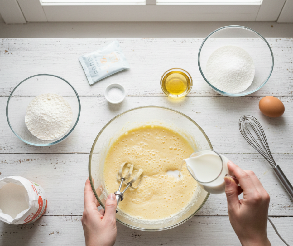 Jaja pjenasto umutiti sa šećerom i vanilin šećerom dok smjesa ne postane svijetla i gusta. Dodati ulje i mlijeko te kratko izmiješati. Brašno, prašak za pecivo i sol pomiješati u posebnoj zdjeli pa postupno dodavati u smjesu s jajima, lagano miješajući dok se ne dobije glatka i ujednačena smjesa. Smjesu izliti u kalup i peći 25–30 minuta, dok biskvit ne dobije zlatnu boju i čačkalica umetnuta u sredinu ne izađe suha. Pečeni biskvit ohladiti i po potrebi prerezati vodoravno na dvije kore.