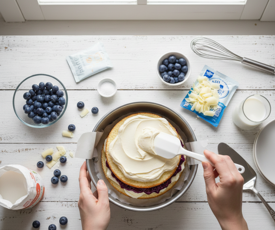 Na tanjur za posluživanje staviti prvu koru biskvita. Premazati polovinom kreme od bijele čokolade, zatim ravnomjerno rasporediti sloj borovnica. Prekriti drugom korom biskvita i cijelu tortu premazati ostatkom kreme. Površinu poravnati špatulom. Tortu staviti u hladnjak na najmanje 3 sata, idealno preko noći, kako bi se potpuno stegnula.