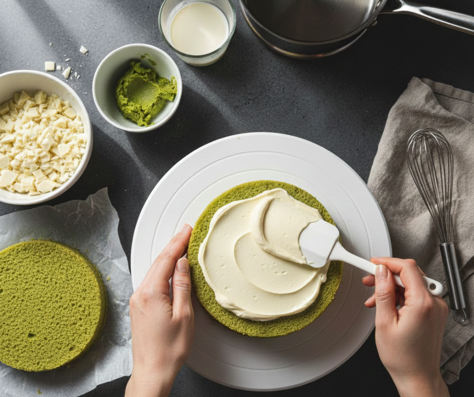 Prvi sloj biskvita lagano natopite mlijekom po želji. Premažite slojem kreme od bijele čokolade. Stavite drugi sloj biskvita i premažite preostalom kremom. Ukrasite sjeckanim pistacijama, listićima bijele čokolade i eventualno svježim bobicama.