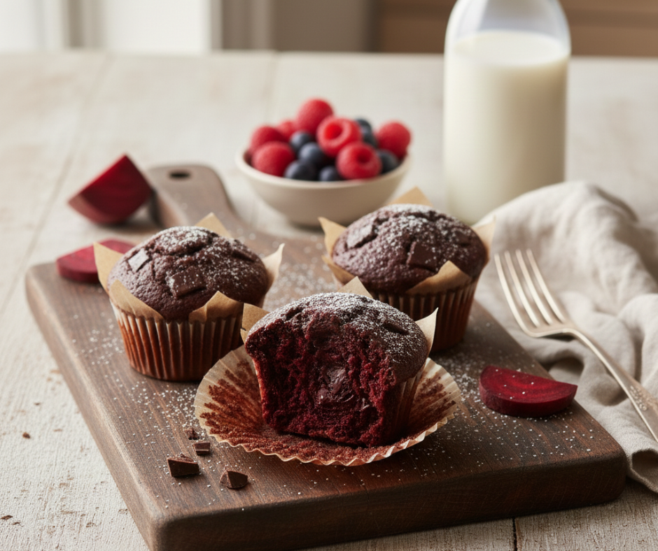 Ponekad se najbolji recepti rađaju iz neočekivanih kombinacija. Tako je nastao ovaj recept za veganske muffine od cikle i kakaa, spoj prirodne slatkoće i sočnosti cikle s intenzivnim čokoladnim okusom kakaa. Muffini su mekani, bogati bojom i teksturom, a pritom potpuno veganski i bez umjetnih sastojaka, što ih čini savršenim izborom za doručak, međuobrok ili zdravi desert.