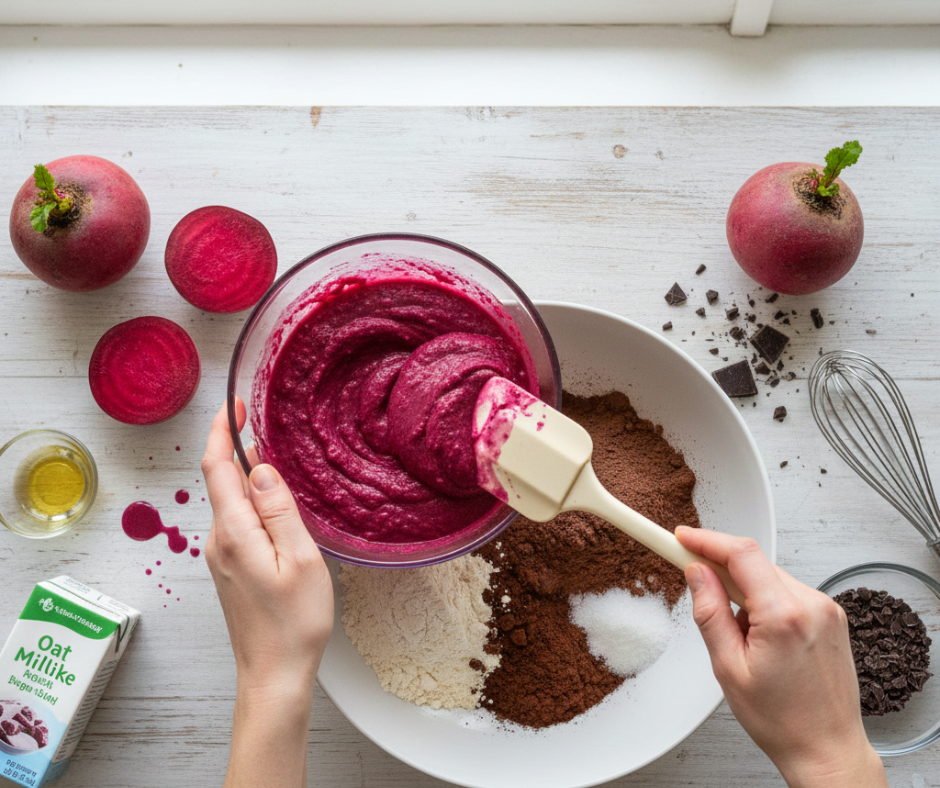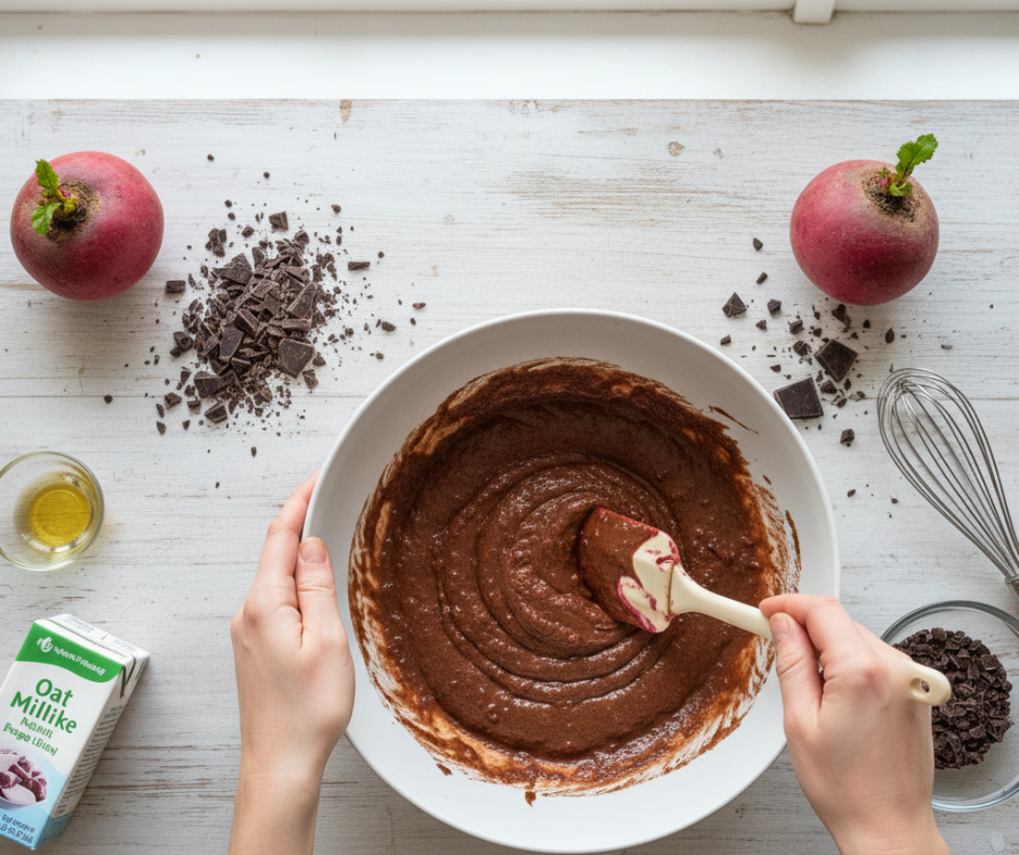 U velikoj zdjeli pomiješajte suhe sastojke: brašno, kakao, šećer, prašak za pecivo, sodu bikarbonu i sol. U drugoj zdjeli izmiksajte pire od cikle s biljnim mlijekom, uljem, ekstraktom vanilije i javorovim sirupom dok ne postane glatka smjesa. Mokre sastojke dodajte u suhe i lagano promiješajte špatulom ili pjenjačom, samo dok se sastojci ne povežu. Smjesa treba biti jednolična, ali ne previše miješana. Na kraju umiješajte nasjeckanu čokoladu.